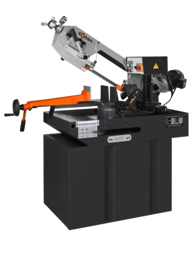 The Mitering Band Saw comes equipped with a manual vise and adjustable hydraulic down feed. It is an ideal band saw for the small to medium machine shop, maintenance shop, metal fabricating shop, school, and for limited run production work. It is a great machine for cutting square, round, and rectangular solids, as well as tubing material. Its solid construction ensures many years of reliability and accuracy at a high level of performance.