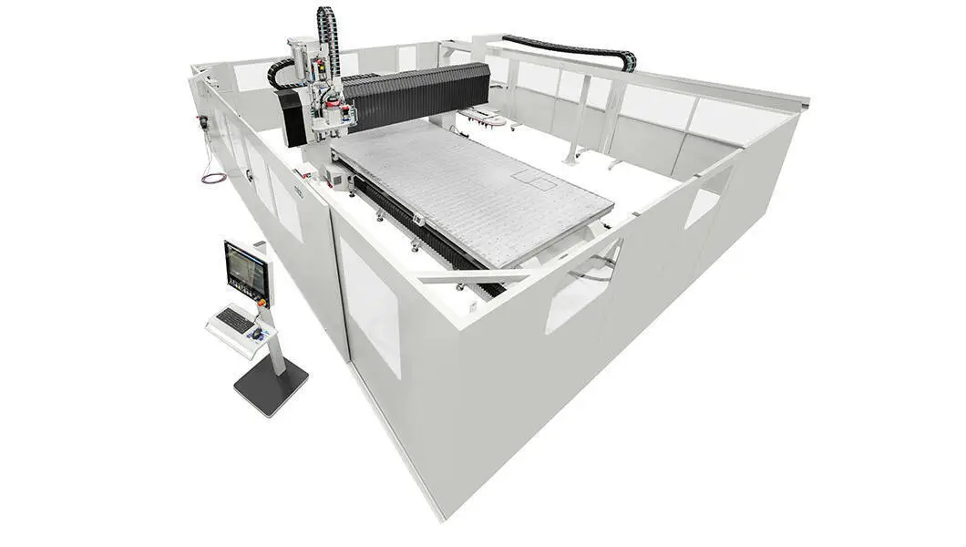 Machining centre with 3, 4 or 5 interpolated axes specifically designed for high speed work on large panels or long and narrow pieces made of composite materials, aluminium and sandwich of different materials.